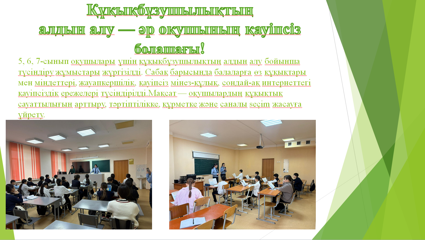 5, 6, 7-сынып оқушылары үшін құқықбұзушылықтың алдын алу бойынша түсіндіру жұмыстары жүргізілді. Сабақ барысында балаларға өз құқықтары мен міндеттері, жауапкершілік, қауіпсіз мінез-құлық, сондай-ақ…