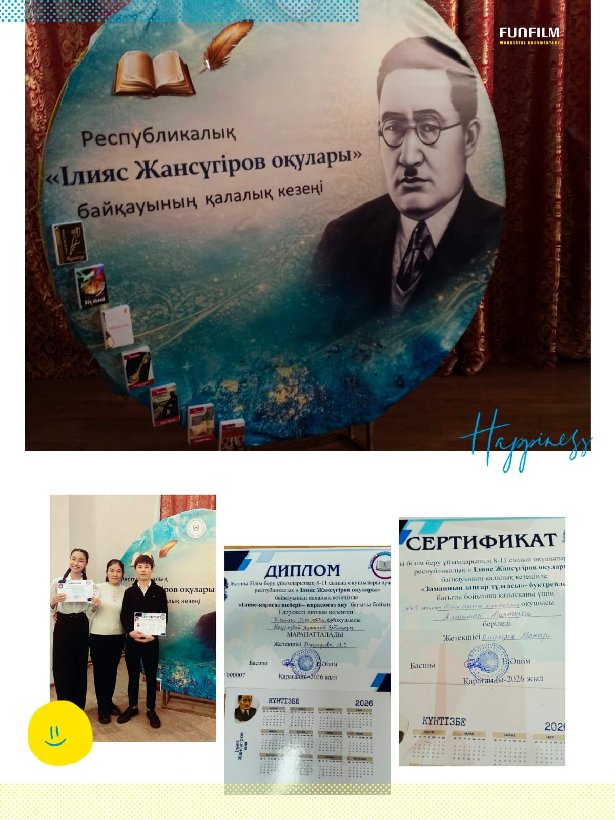 14 қаңтар күні Республикалық «Ілияс Жансүгіров оқулары» байқауының қалалық кезеңінде «Ілияс -қарасөз шебері» - көркемсөз оқу номинациясы бойынша 8"Ә" сынып оқушысы Наурызбай Алтынай қатысып,жүлделі б…
