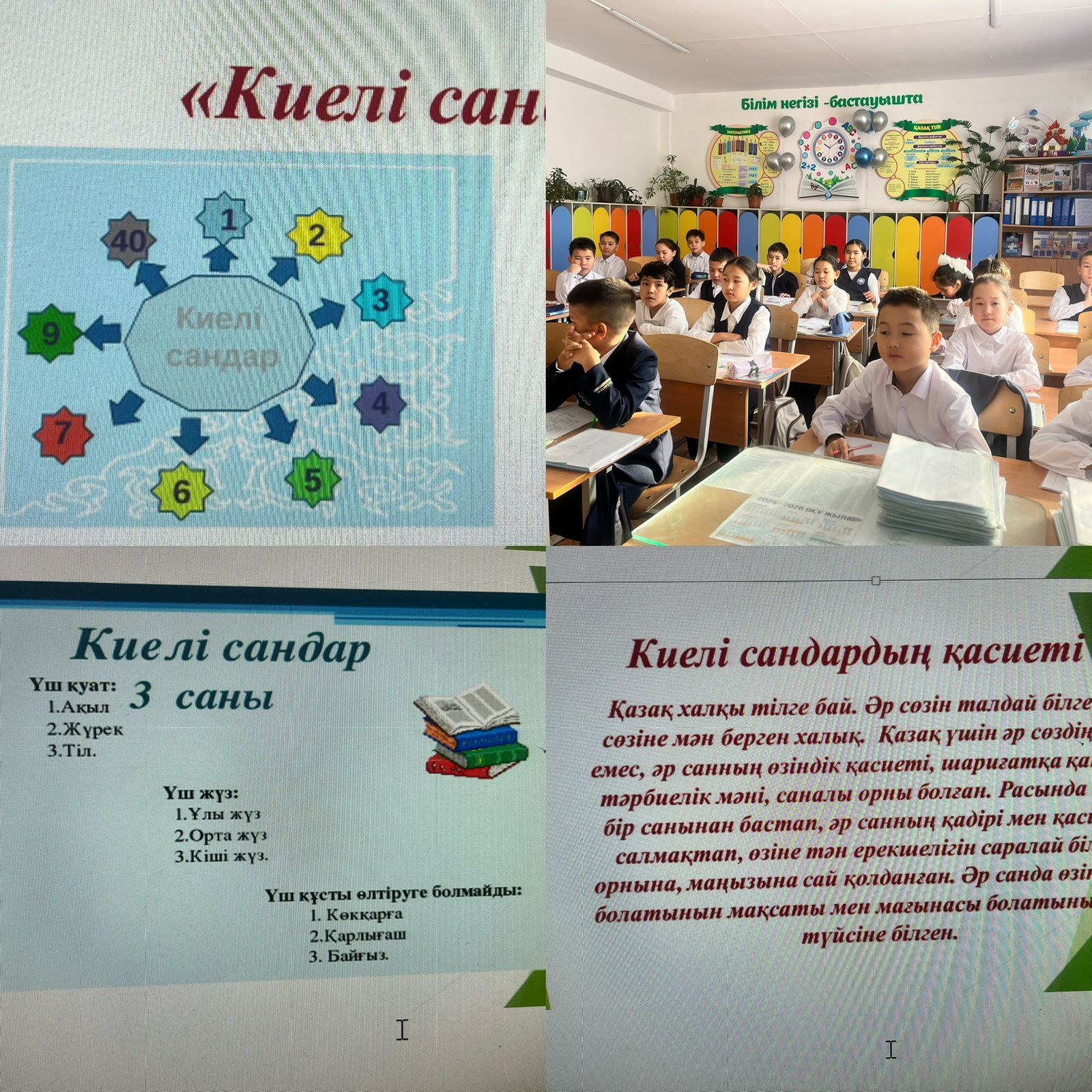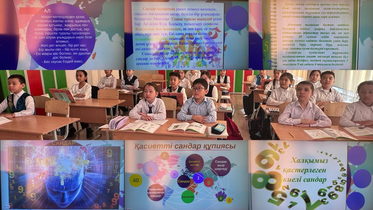 4 сыныптар арасында “Киелі сандар” тақырыбында сыр-сұхбат жүргізілді. Барлық сынып белсене қатысты.