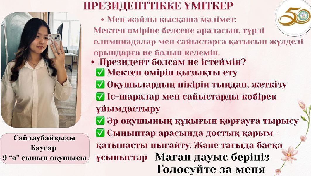 Мектеп Президентіне үміткер 9 Ә сынып оқушысы Сайлаубайқызы Кәусар #мектеппрезидентінсайлау2025