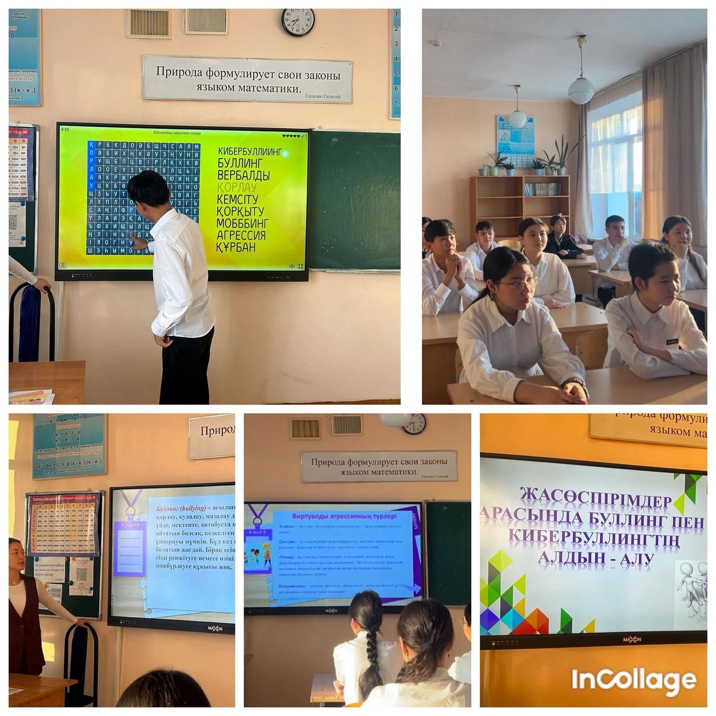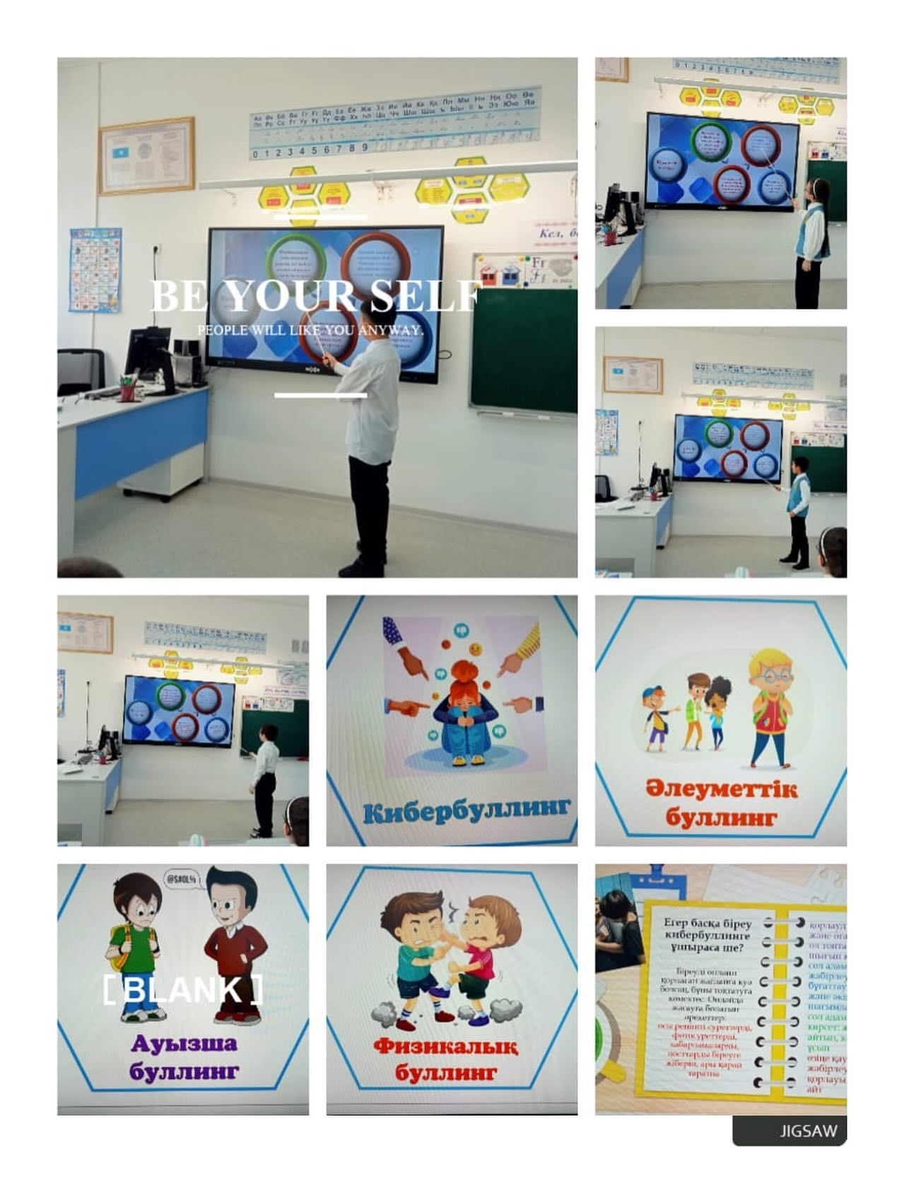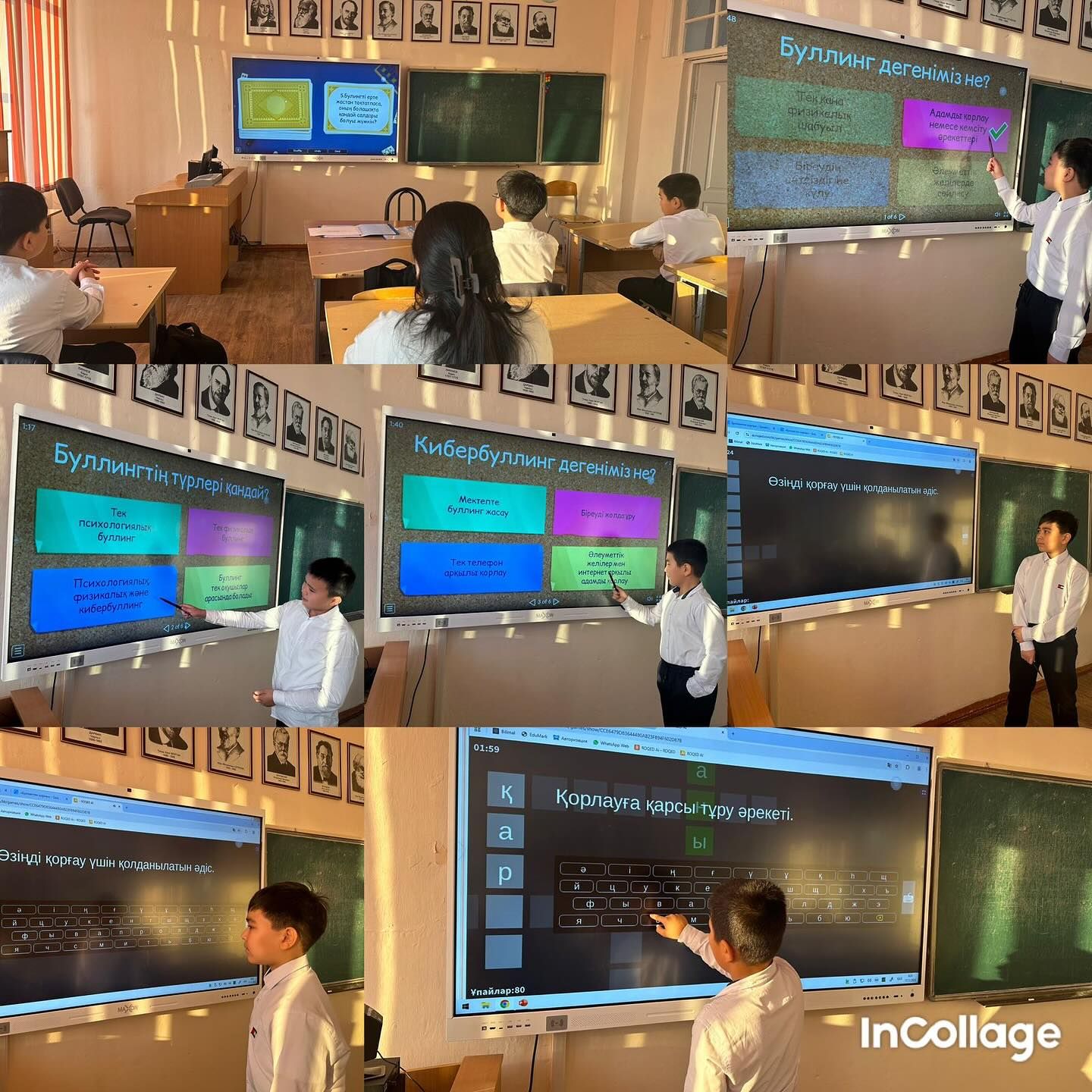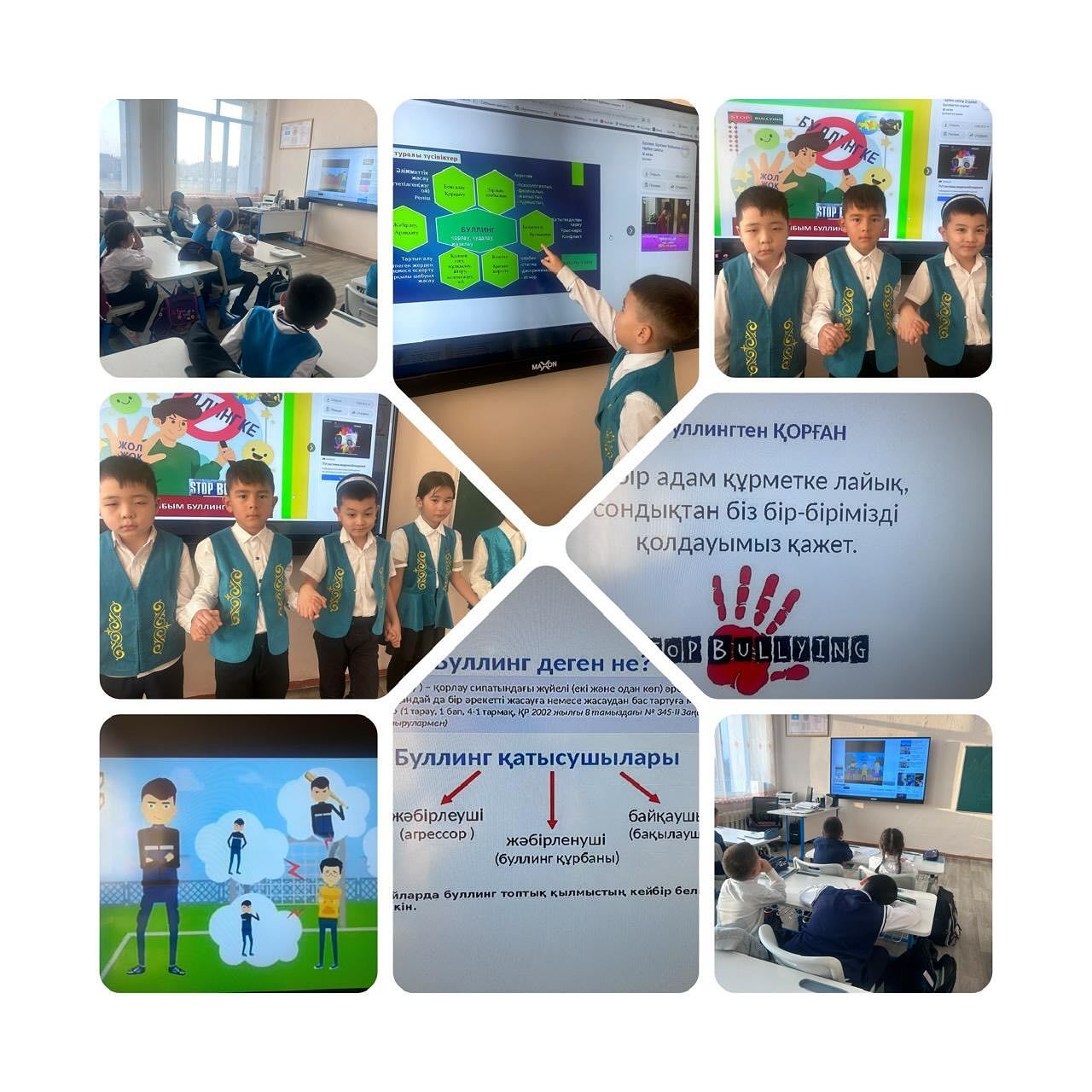 8 “Ә” сыныбында «Буллингтен қорған» тақырыбында сынып сағаты өтті. Мақсаты: Оқушыларға буллинг ұғымын түсіндіру, оның түрлері мен зардаптары туралы мағлұмат беру, қиын жағдайда өзіңді қалай қорғау керектігін үйрету және достық қарым-қатынас орнатуға баул