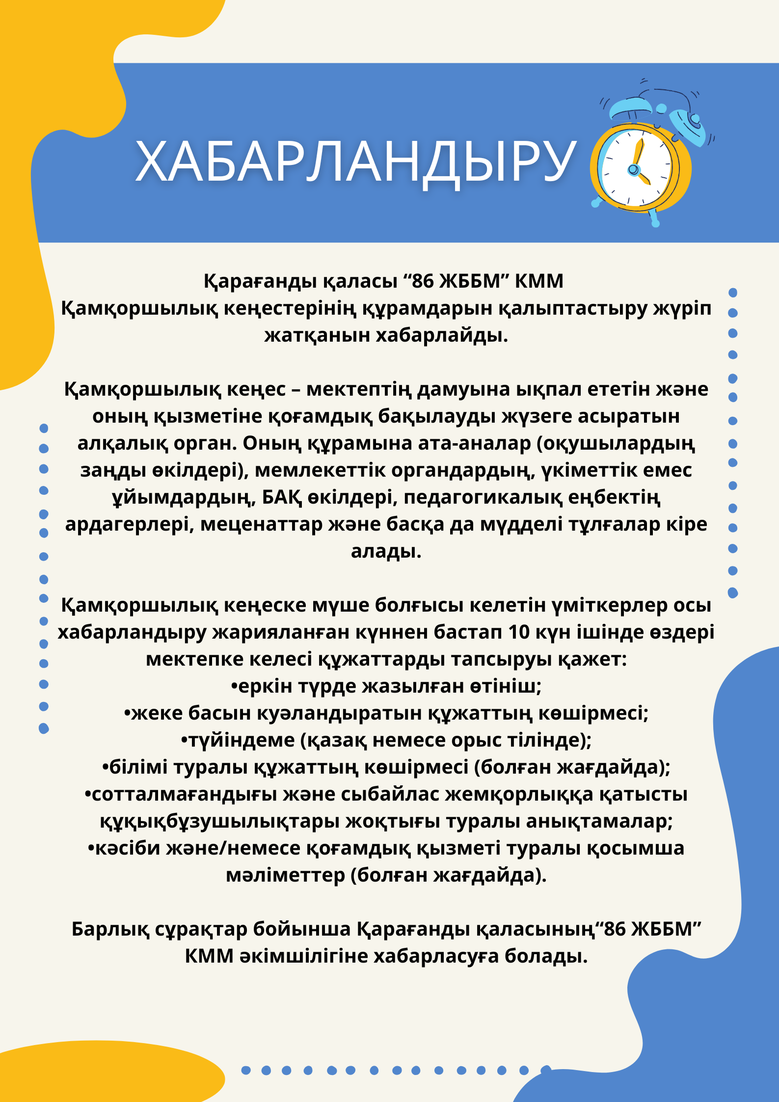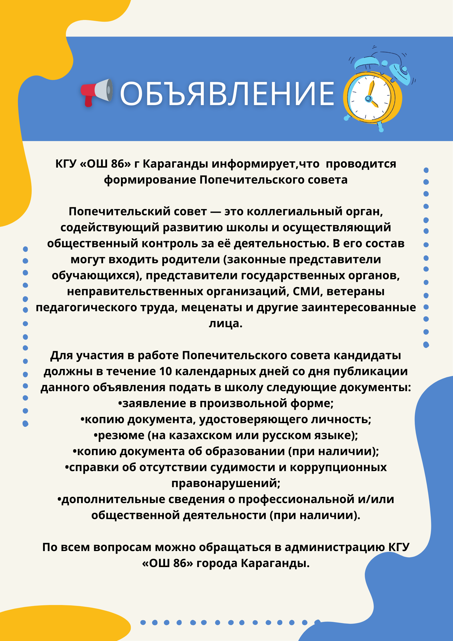 КГУ «ОШ 86» г Караганды информирует, что во всех организациях образования города Караганды проводится формирование Попечительских советов.