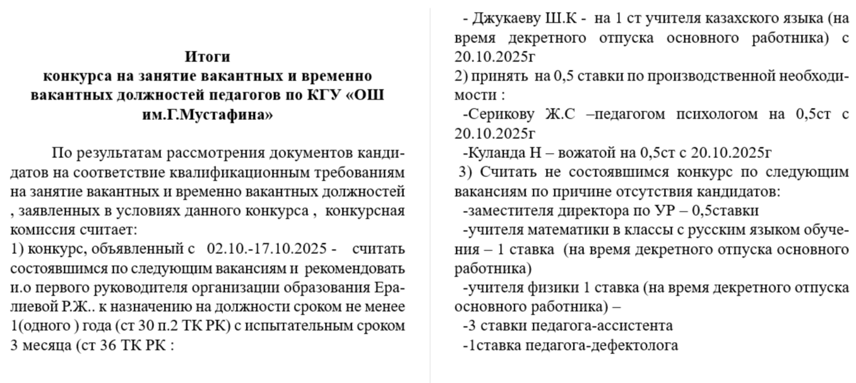Қорытынды бос және уақытша жұмысқа орналасуға конкурс "ЖББМ" КММ бойынша педагогтардың бос лауазымдары.Г. Мұстафина"