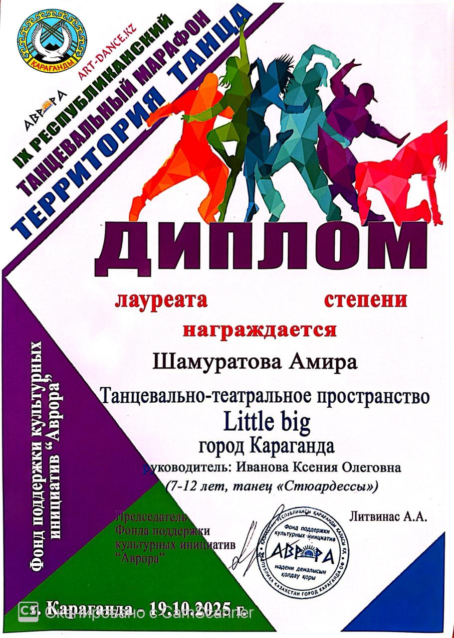 Шамуратова Амира 6-12 жас аралығындағы би аумағының IX Республикалық би марафонына қатысып, "стюардессалар", "Арман", "…
