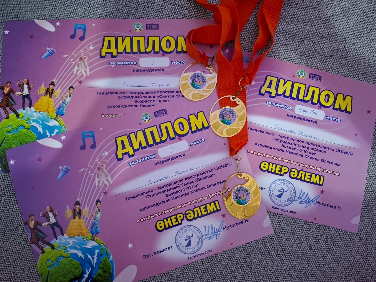 Поздравляем ученицу 3 Г класса Селюкову Карину. Она вместе со своим коллективом приняла участие в творческом конкурсе-фестивале Өнер Әлемі, где завоевали Гран при и два 1 места. Молодцы! Так держать…