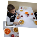 Рубрика: школьное питание. Сегодня в меню:салат из белокочанной капусты и яблок, суп гороховый с мясом, булочка с творогом, хлеб р/п, напиток лимонный.