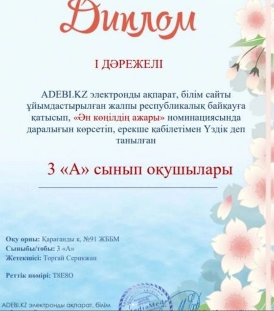 Оқушыларды сөз өнеріне баулу, шығармашылық тұрғыдан дамыту аясында ұйымдастырылған байқаудағы жетістіктерімен құттықтаймыз. Сынып жетекшісі: Торгай Серикжан.