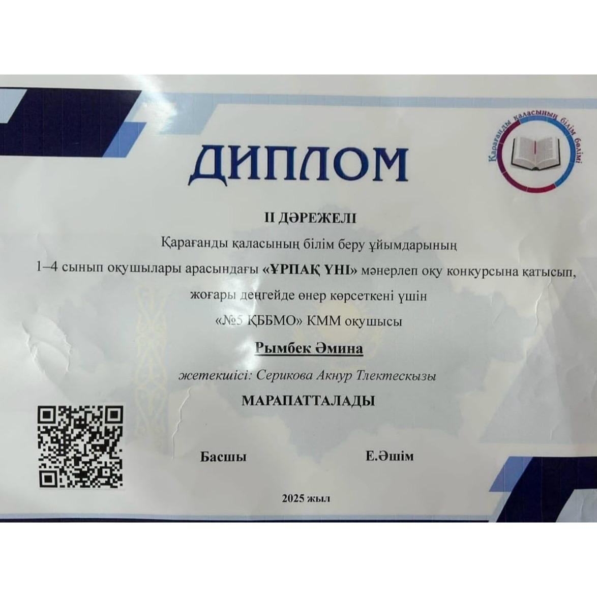 1-4 сыныптар арасында "Ұрпақ үні" мәнерлеп оқу бойынша ІІ орын алған 4"А" сынып оқушысы Рымбек Әминаны құттықтаймыз!