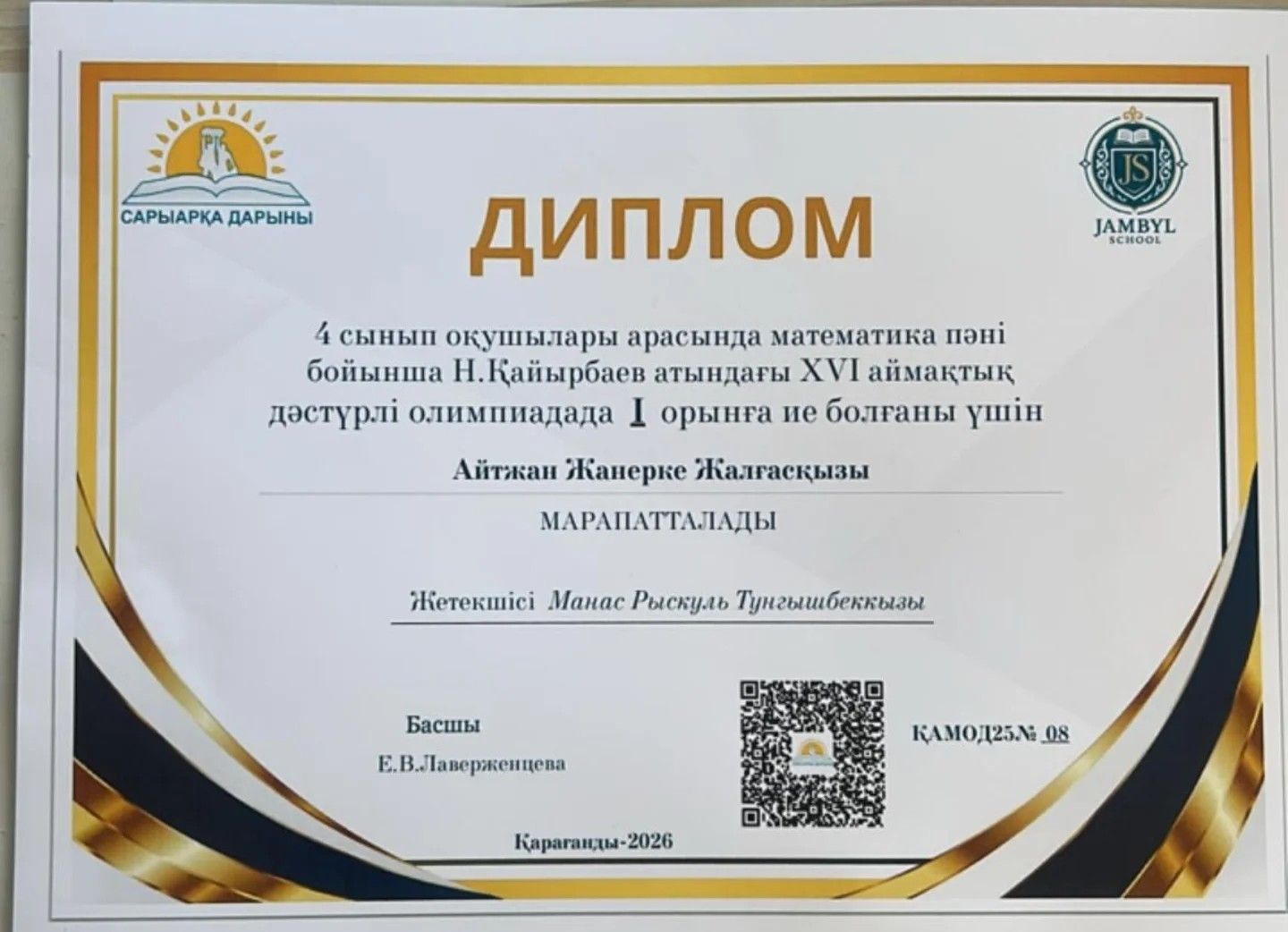 4 сынып оқушылары арасында математика пәні бойынша Н.Қайырбаев атындағы XVI аймақтық дәстүрлі олимпиадада 4 “Ә” сынып оқушысы Айтжан Жанерке Жалғасқызы І орынды иеленіп Дипломмен марапат…