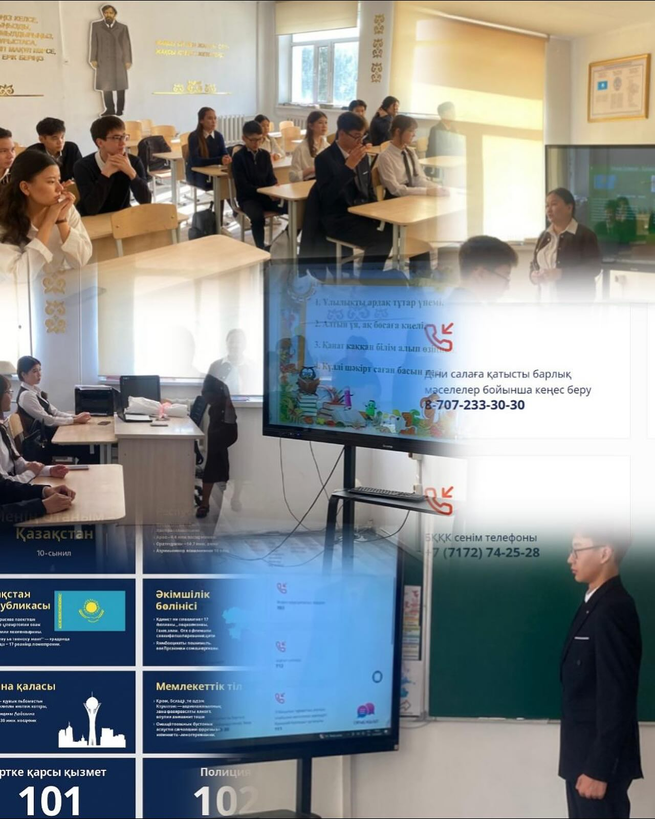 2 сентября 2025 года в 10 классе "А" прошел классный час на темы "Моя Родина - Казахстан", "Горячая линия". Классный руководитель: М.А. Сагибаева