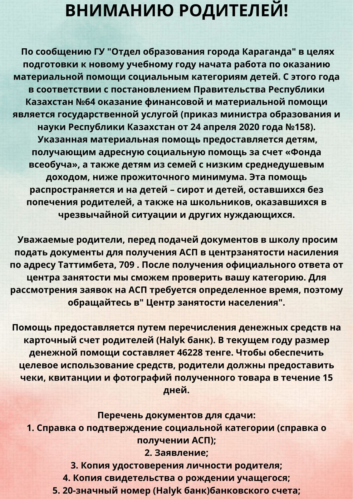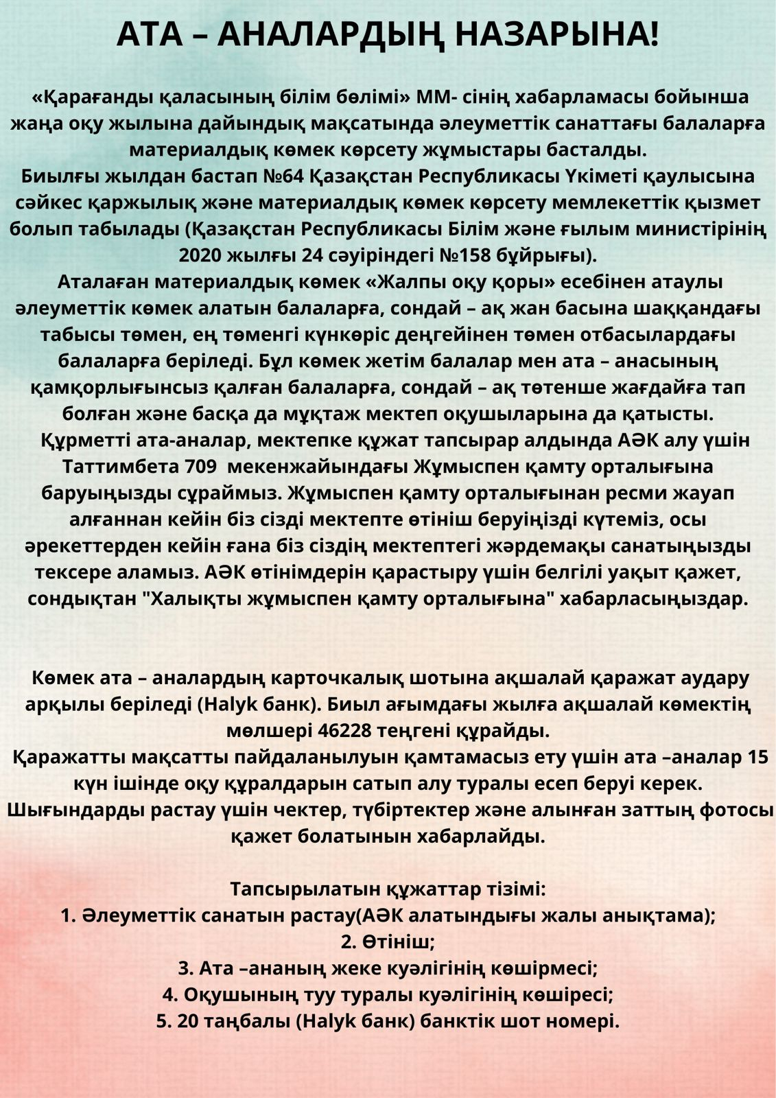Ата – аналардың назарына! «Қарағанды қаласының білім бөлімі» ММ- сінің хабарламасы бойынша жаңа оқу жылына дайындық мақсатында әлеуметтік санаттағы балаларға материалдық көмек көрсету жұмыстары басталды. Биылғы жылдан бастап №64 Қазақстан Республикасы