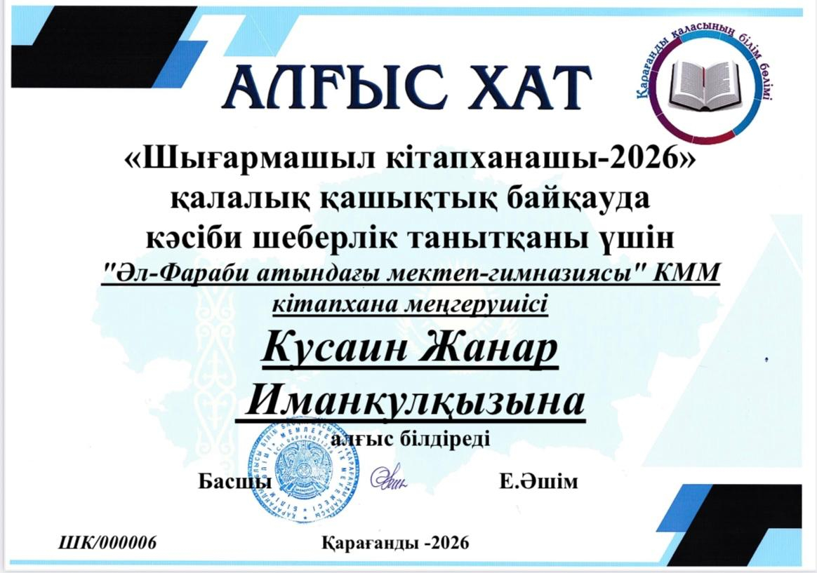 ҚҰТТЫҚТАЙМЫЗ! Қарағанды қаласының білім бөлімі ұйымдастырған «Шығармашыл кітапханашы–2026» қалалық қашықтық байқауында кәсіби шеберлігімен ерекшеленгені үшін кітапхана меңгерушісі Кусаин Жанар Иманқұлқызы Алғыс хатпен марапатталды. Әріптесімізді жетістігі