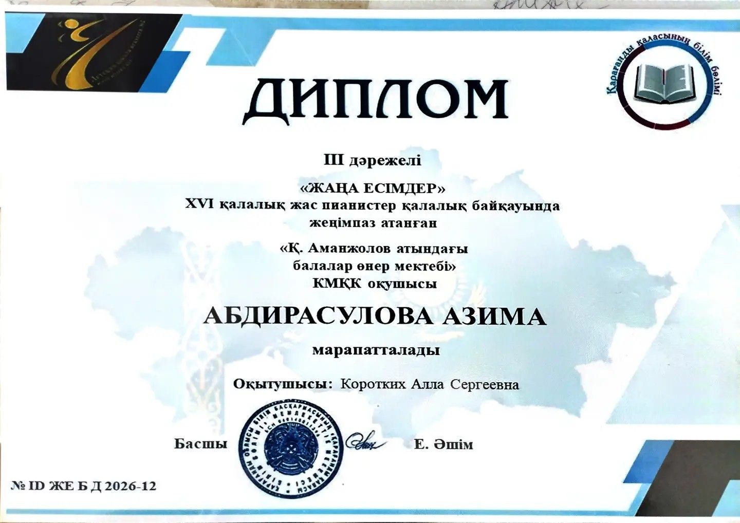 24 января 2026 года состоялся XVI городской конкурс пианистов «Жаңа есімдер», посвящённый памяти старейших педагогов-музыкантов города Караганды среди учащихся Детских музыкальных школ и Детских школ искусств.
