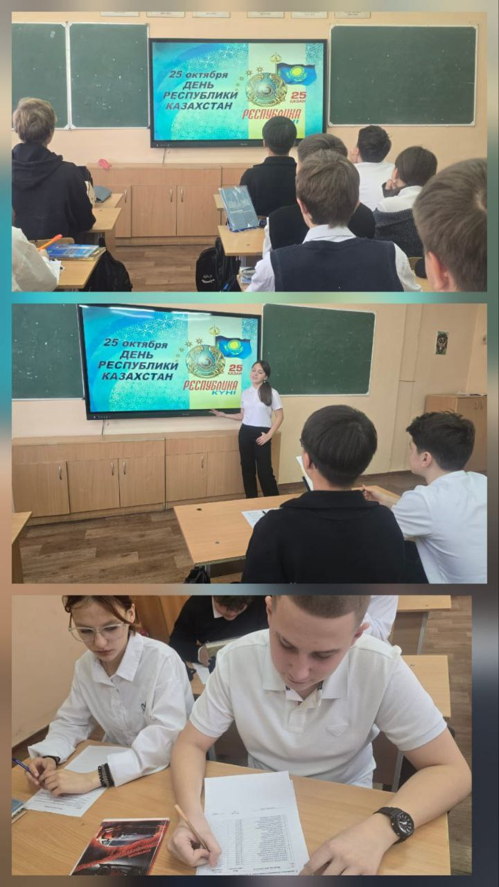 В рамках единой программы воспитания "Адал азамат" в 9 "Г" классе был проведён классный час, посвящённый Дню Республики Казахстан. Ребята познакомились с историей принятия Декларации о государственном суверенитете Казахстана, обсудили значение этого важного события для становления независимости нашей страны и роли каждого гражданина в её развитии.