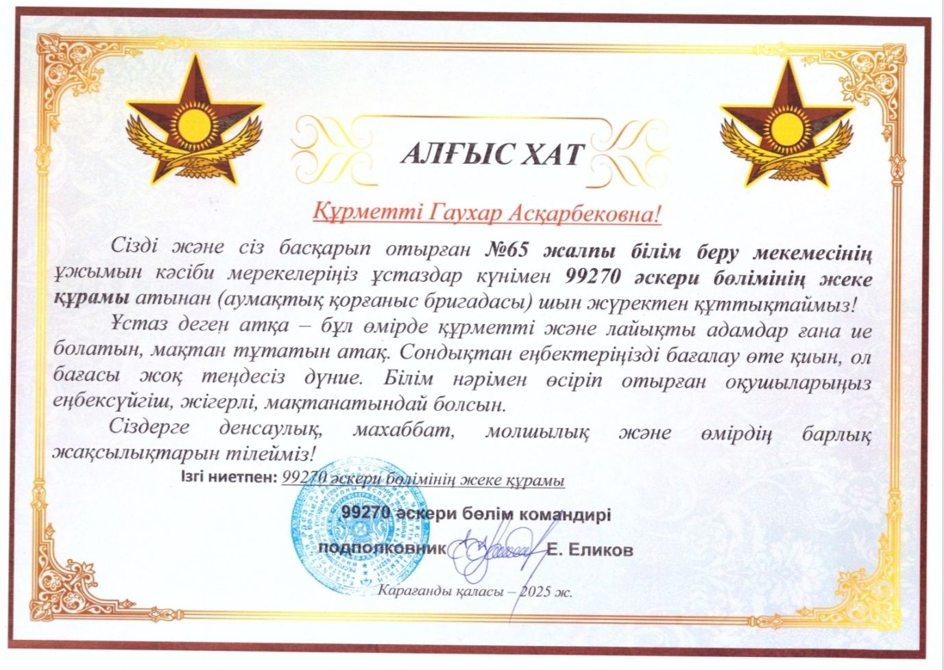 N65 жалпы білім беретін мектеп ұстаздарын *99270* әскери бөлімінің жеке құрамы (аумақтық қорғаныс бригадасы) мерекемен құттықтады.