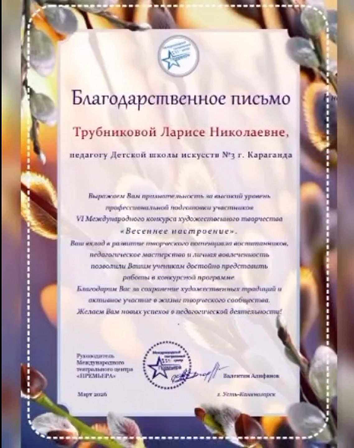 Учащиеся ДШИ №3 (отделение ИЗО) приняли участие в VI Международном конкурсе «Весеннее настроение». Работы юных художников получили высокую оценку жюри, а участники стали призёрами конкурса.