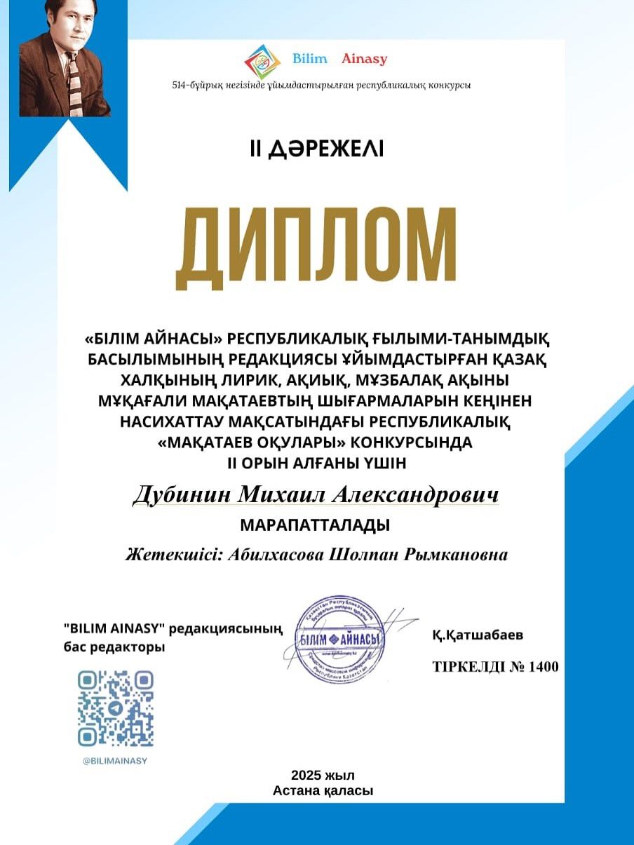 О»а»класс приняли участие в республиканском конкурсе *«Мұқағали оқулары»*, организованном редакцией *«Bilim-ainasy»*.