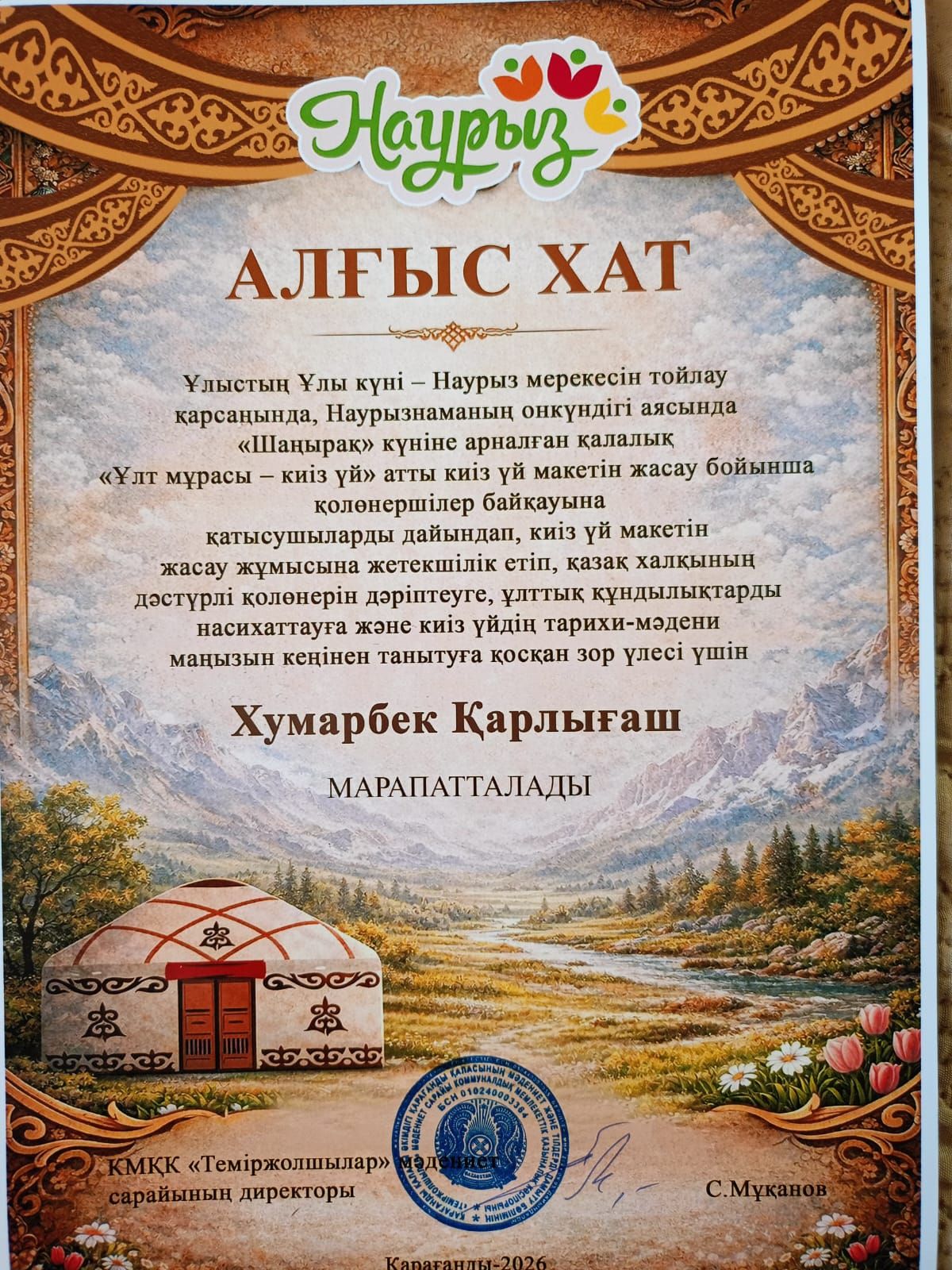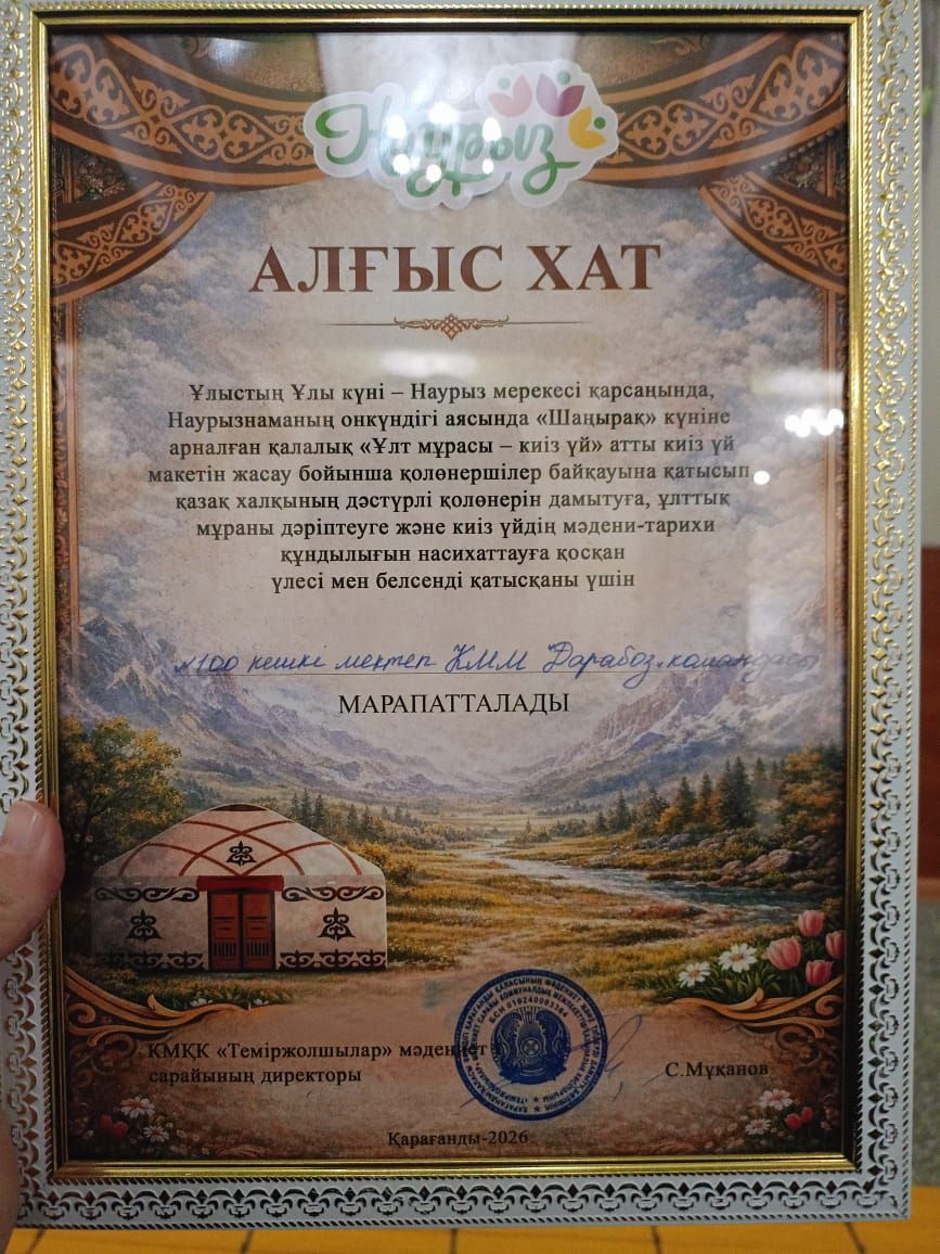 Основатель и учредитель общественного фонда «ДАРАБОЗ», популяризирующего национальные ценности казахского народа, член Союза этнодизайна и представитель по Карагандинской области, обладатель нагрудного знака «Патриот Астаны» 2024 года, а также звания «Ерен еңбек иесі» 2025 года Жакупова Асемгуль Кадетовна вручила Почетные грамоты общественного фонда «ДАРАБОЗ» Хумарбек Карлыгаш и коллективу КГУ «ВШ № 100» за вклад в популяризацию национальных ценностей казахского народа.