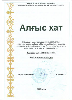 Қазақ тілі мен әдебиеті пәнінің мұғалімі Заркеева Д.Н. облыстық семинарды ұйымдастыруда «Оқу шаттығы» жобасы, «Бір аймақ – бір кітап» акциясы аясында өткізілген іс-шараларда белсенділік танытқаны және білім саласына қосқан үлесі үшін алғыс хатпен марапатталды.