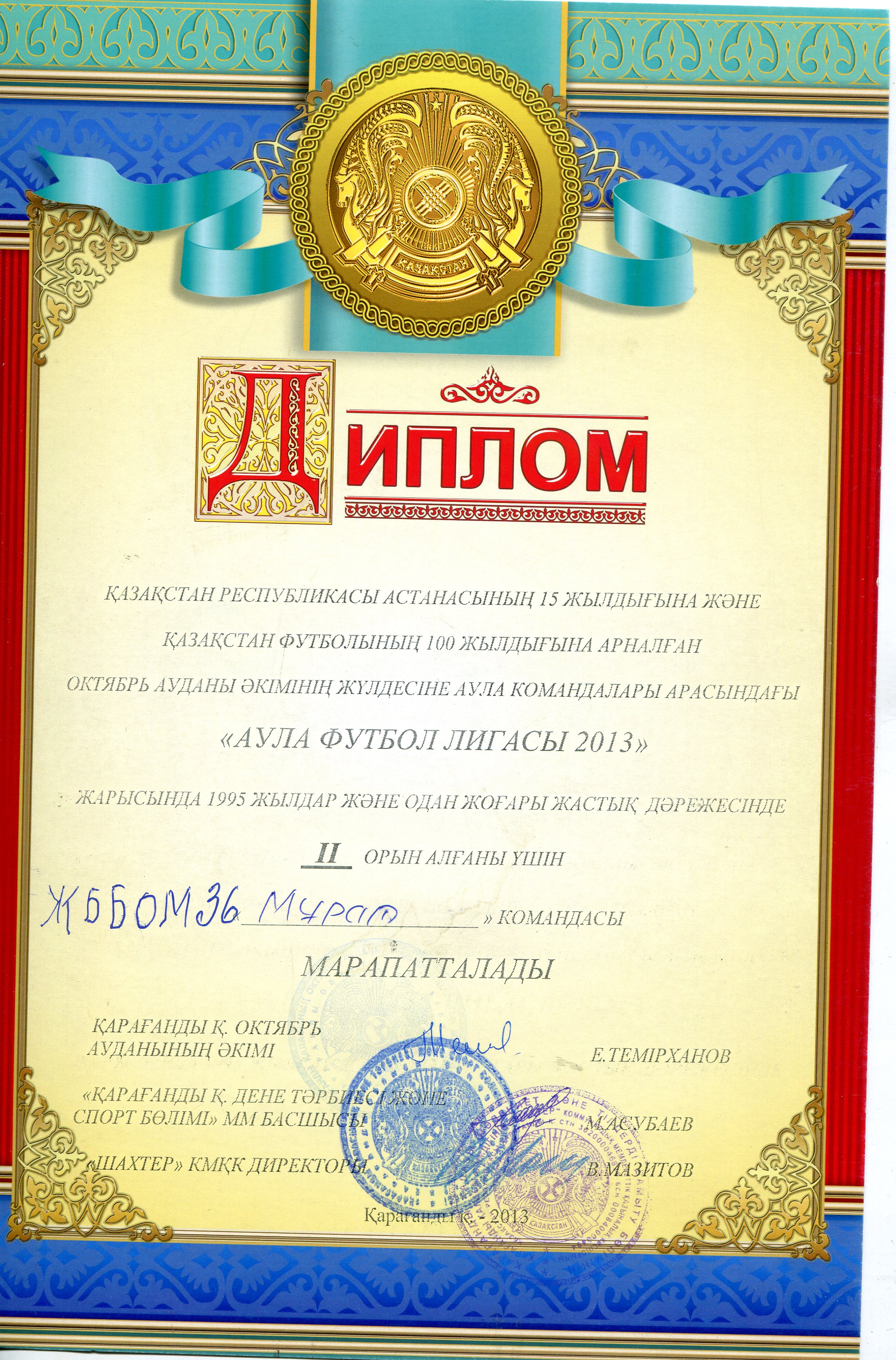 «Аула футбол лигасы - 2013» атты Қазақстан Республикасының Астанасының 15 жылдығына және Қазақстан футболының 100 жылдығына орай ұйымдастырылған Октябрь аудан әкімнің жүлдесіне № 36ЖББОМ «Мұрат» командасы I-II орынға иеленді. Құттықтаймыз!