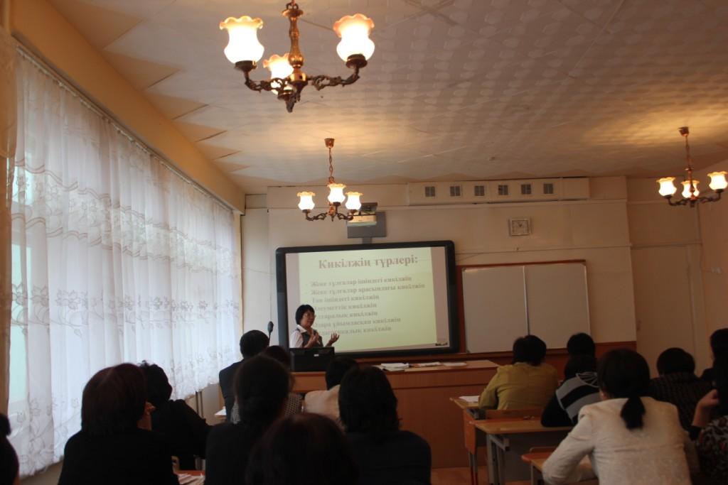 Мақсаты: Ұстаздар арасындағы қарым-қатынасты нығайту және мәдени сөйлей білуге, өзара жағымды - қарым қатынас шеңберін арттыру, парасатты, ұйымшыл тұлға тәрбиелеуге бағыт-бағдар беру;