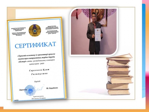 «Туристік-өлкетану іс-әрекеттері арқылы оқушыларға патриоттық тәрбие берудің әдістері»атты републикалық семинарға қатысқаны үшін Сарсекеев Қуат Ғалымұлына сертификат берілді.