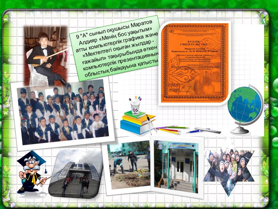 Ученик 9 "А" класса Маратов Алдияр принял участие в областном конкурсе компьютерной презентации на тему  "Школьные годы чудесные..." и получили свидетельсва за участие.