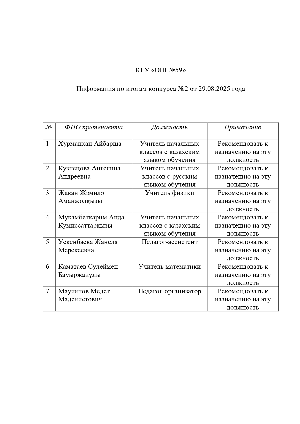| 4 | Мукамбеткарим Аида Кумиссаттарқызы | Учитель начальных классов с казахским языком обучения | Рекомендовать к назначению на эту должность |