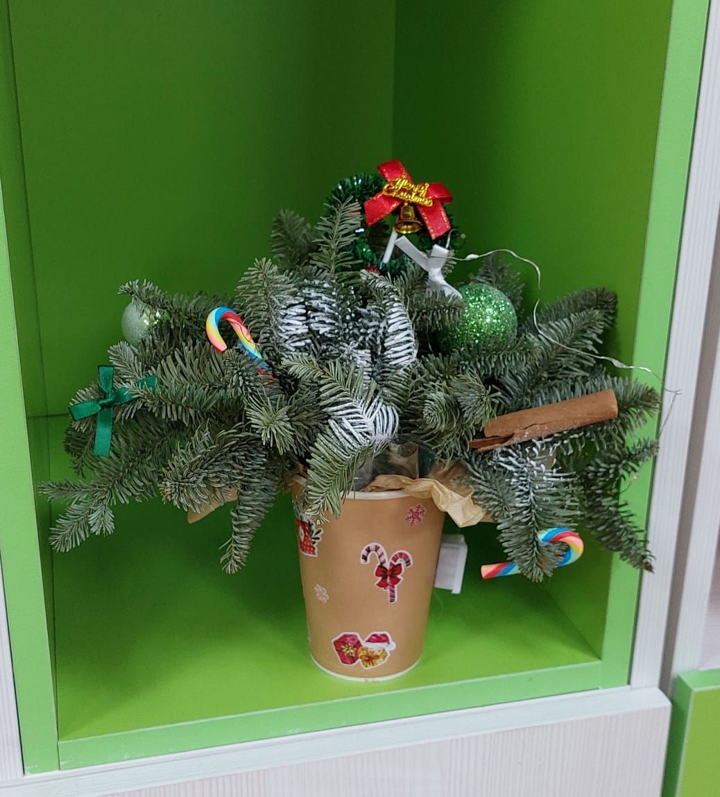 Эти праздничные композиции стали настоящим украшением кабинета: зелёные веточки и сияние огоньков создают атмосферу зимнего чуда и радости. Ребята и учителя с удовольствием любуются работой, которая наполняет класс новогодним настроением.