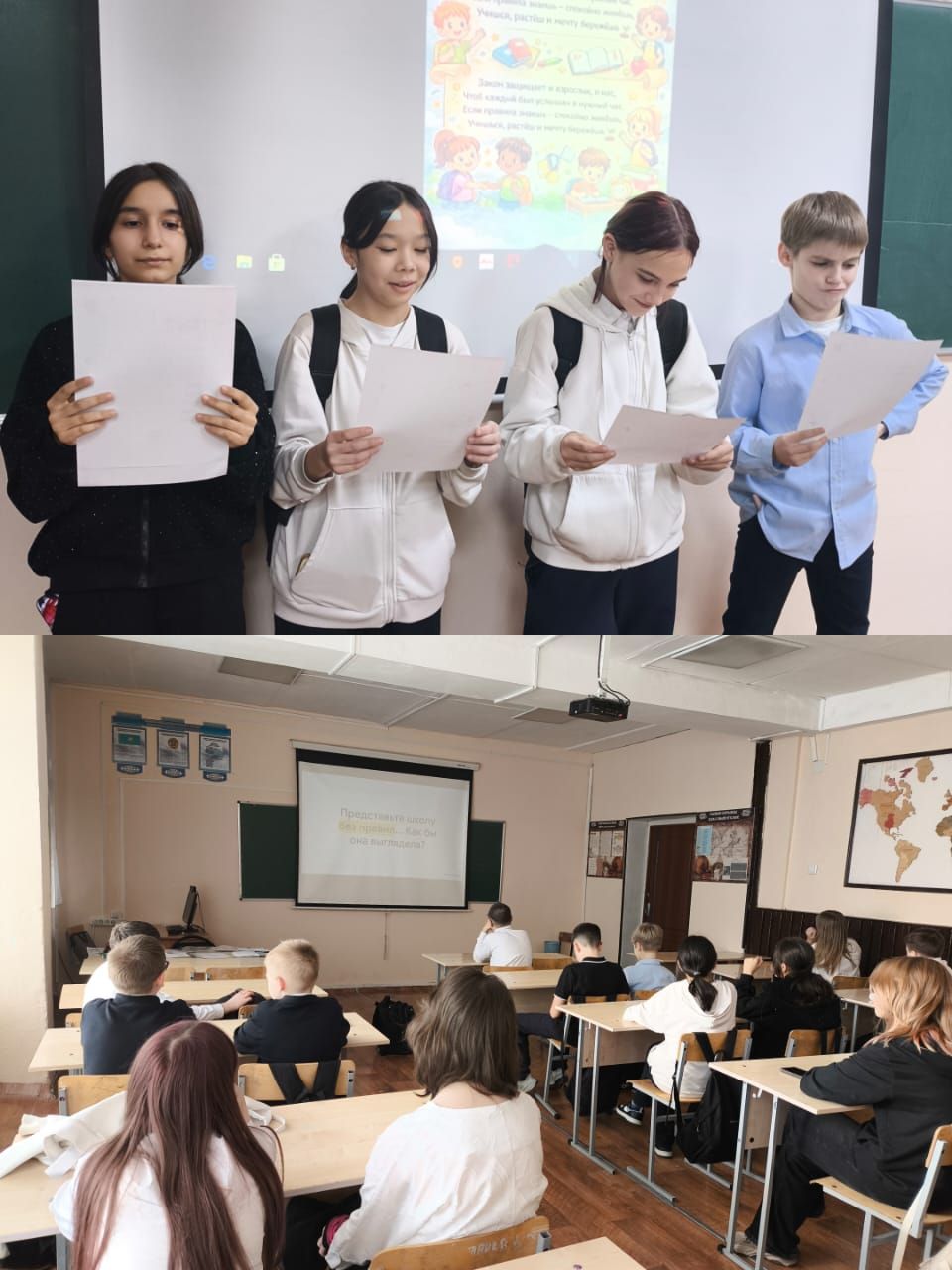 В ходе мероприятия некоторые учащиеся подготовили и представили материалы по таким вопросам, как Устав школы, права и обязанности учащихся, родителей и учителей, а также правила внутреннего распорядка школы.