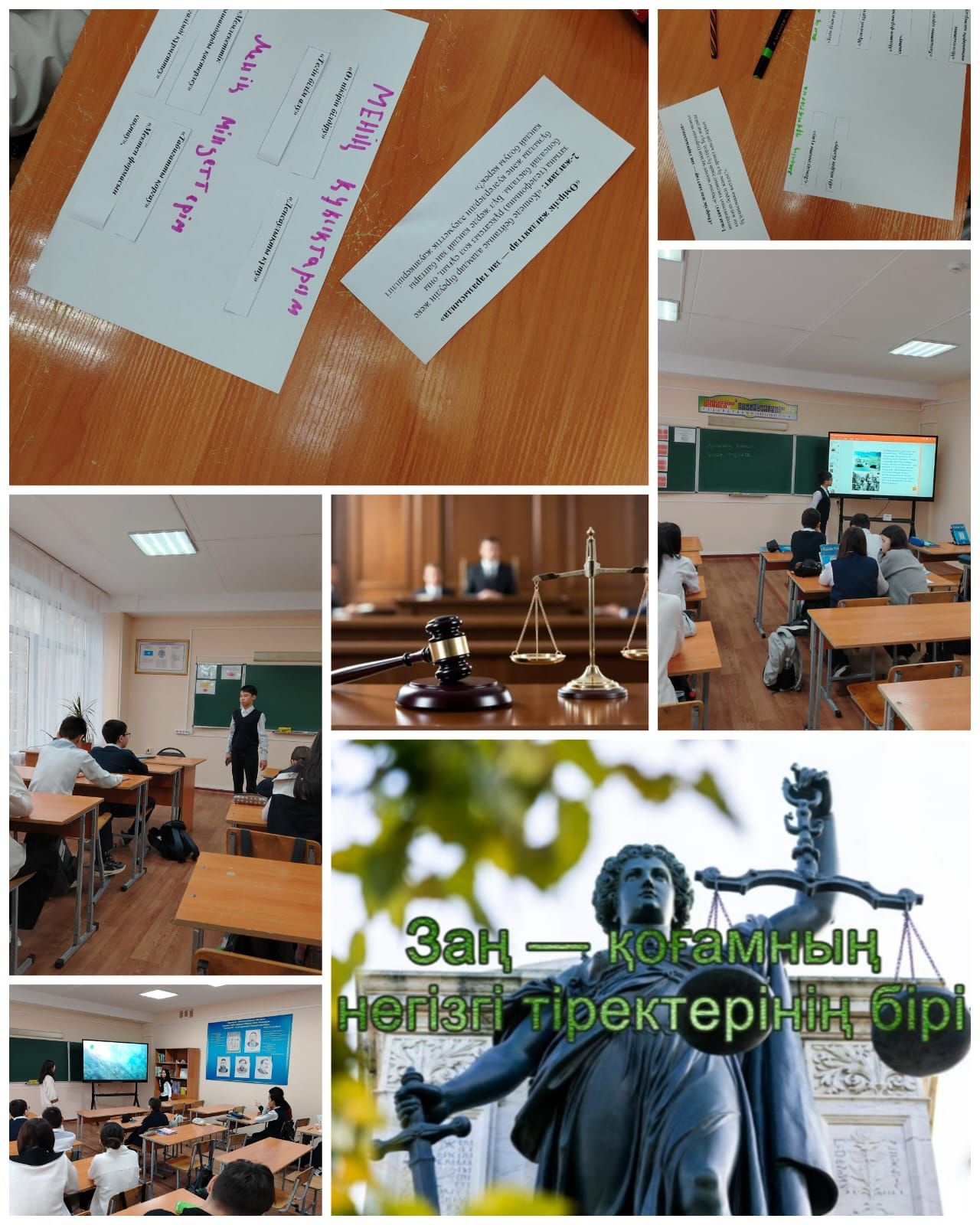 Сынып сағатында оқушыларға «Өмірлік жағдаяттар — заң таразысында» тақырыбында теориялық білімді практикамен ұштастыру үшін нақты өмірден алынған, мектеп пен көшеде жиі кездесетін жағдаяттық тапсырмалар беріледі. Оқушылар талдауға қызыға қатысты.