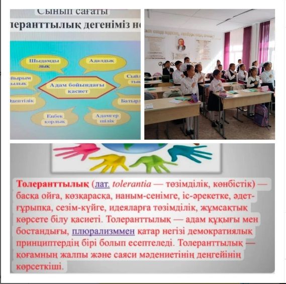 10.11.2025ж."Ж.Ақбаев атындағы ЖББМ"КММ 3 "Б"сынып оқушыларымен "Толеранттылық туралы сөйлесейік" тақырыбында сынып сағаты өтті. Мақсаты: оқушыларға толеранттылық не екенін түсіндіру, оның маңызды құндылық екенін ұғындыру. Оқушыларды басқа адамдарға құрметпен қарауға, достыққа тәрбиелеу.