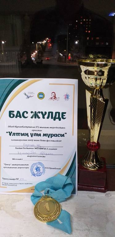 «Үркер» шығармашылықты дамыту орталығының ұйымдастыруымен Шымкент қаласында өткен Абай Құнанбайұлының 175 жылдық мерейтойына арналған халықаралық өнер-білім жарысында «Көркем сөз» номинациясы бойынша «Бас жүлде» иеленген қазақ тілі мен әдебиеті пәнінің мұғалімі Е. А. Хумарбекті жеңісімен құттықтаймыз.