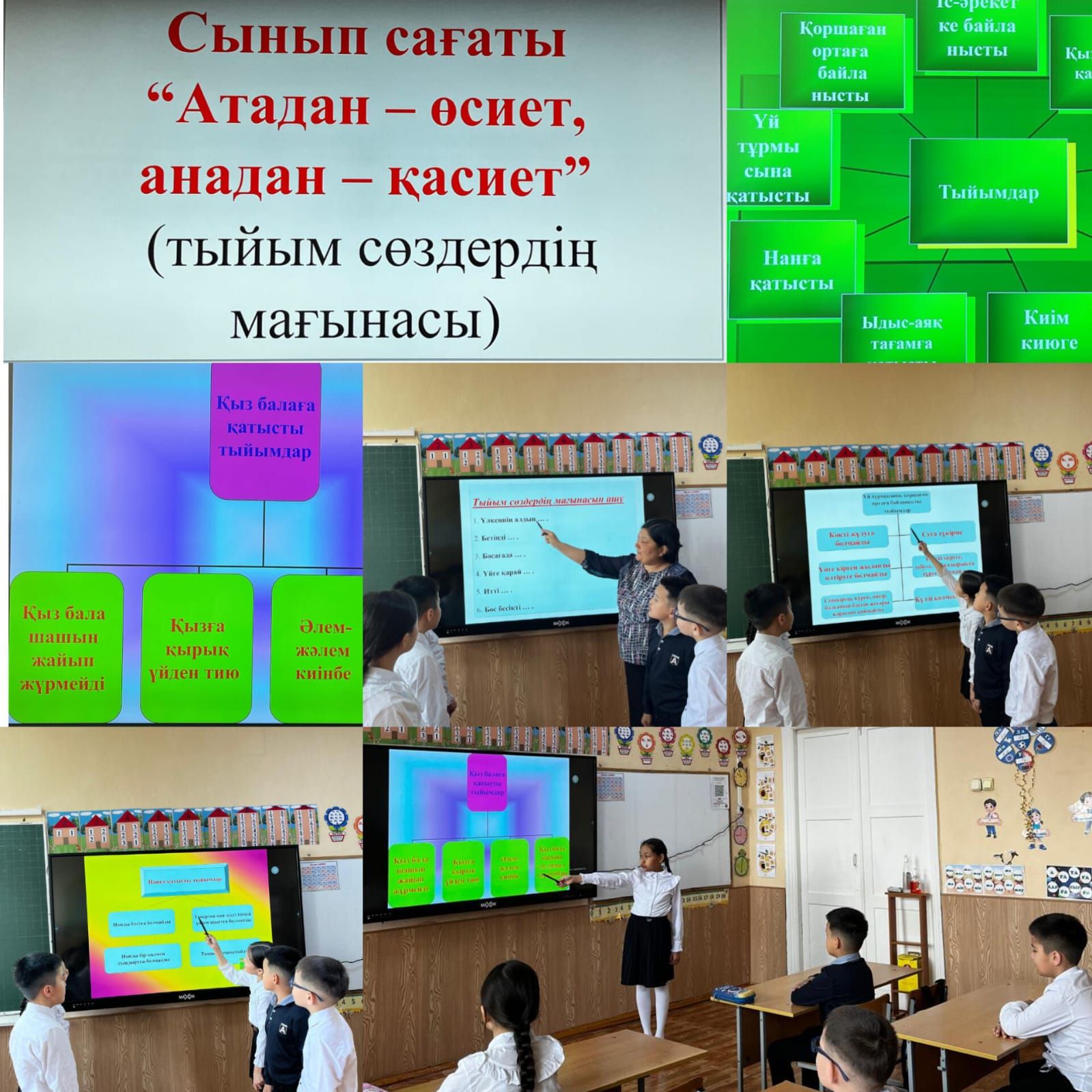 2025 жылдың 21 сәуір «Болашағы зор мамандықтар жоқ, тек болашағы зор мамандар бар» аптаның дәйек сөзі ретінде 1-9 сыныптар аралығында «Атадан-өсиет, анадан қасиет» тақырыбында қауіпсіздік сынып сағаттары болып өтті.