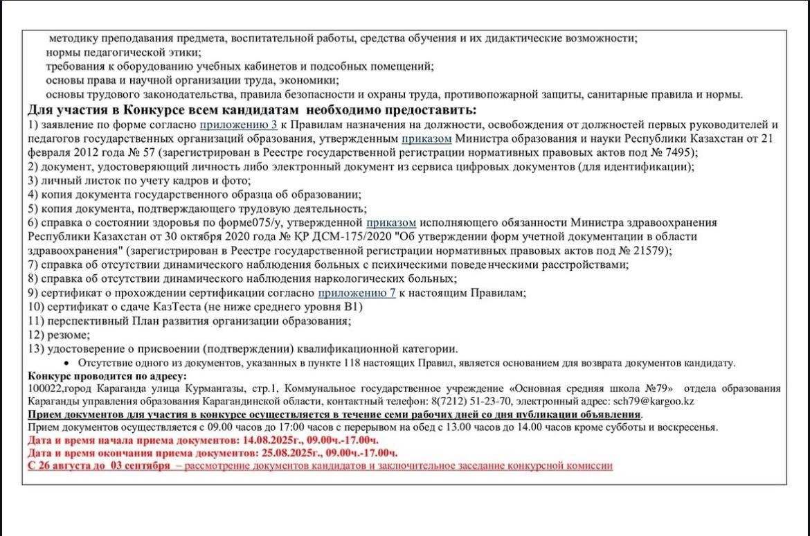 Қарағанды облысы білім басқармасының Қарағанды қаласы білім бөлімінің «№79 негізгі орта мектеп» мемлекеттік мекемесінде бос лауазымға орналасуға конкурс жариялайды.