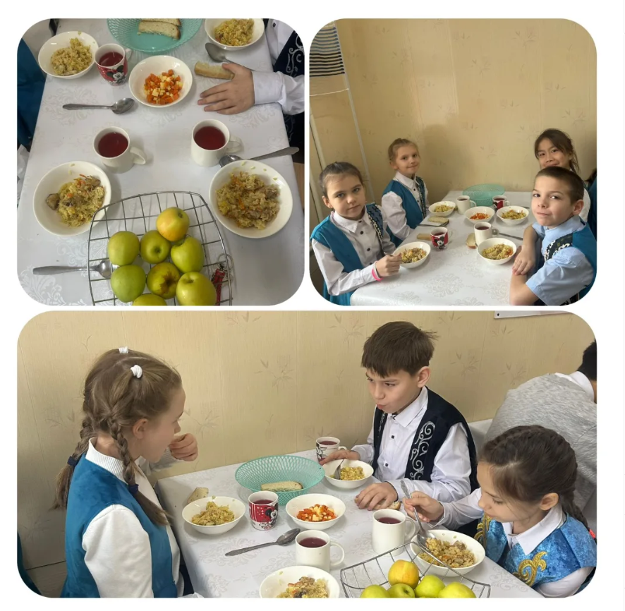 Ас мәзірі айдары: сәбіз қосылған палау, ірімшік қосылған витаминді салат, каркаде шырыны, нан және алма.