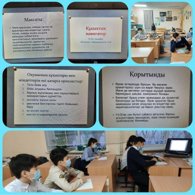 "Құқықтық навигатор" апталығына орай "Жасөспірімнің құқығы мен міндеттері тақырыбында әңгілелесу өткізілді. Мақсаты: өз құқықтары мен міндеттері туралы түсінік қалыптастыру.