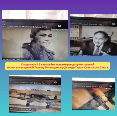 Учащимися 2 Б класса был просмотрен документальный фильм посвященный Талгату Бигельдинову-Дважды Герою Советского Союза.