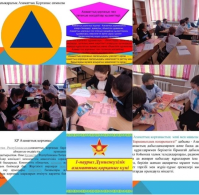 28 ақпан күні 5 «а» сыныбында «1 наурыз Азаматтық қорғаныс күні» тақырыбында сынып сағаты өтті. Мақсаты: Оқушыларға 1 наурыз Азаматтық қорғаныс күні екенін айта отырып, қауіпсіздік шаралармен, сақтану жолдарымен таныстыру, білдіру.