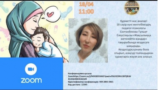 Құрметті жас аналар! 18 сәуір күні мектебіміздің педагог-психологы Солтанбекова Гүлшат Елеусізқызы «Жақсылыққа жетелейтін жандар» тақырыбында кездесуге шақырады. Кездесудің қонағы бола отырып, өзіңізді толғандырған сұрақтарға жауап ала аласыз.