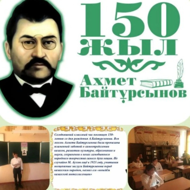 В 10 «А» классе прошёл классный час посвящённый 150-летию со дня рождения Ахмета Байтурсынова. Цели и задачи: Воспитание казахстанского патриотизма и чувства гордости за свою Родину и свой народ, знакомство с жизнью и деятельностью А. Байтурсынова, расшир