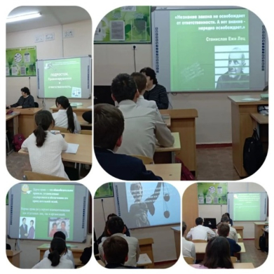 Жастар арасындағы қылмыс пен құқық бұзушылықтың алдын алу, сонымен қатар жасөспірімдердің құқықтық санасын қалыптастыру мақсатында. 8Б сыныбында «Жасөспірім. Құқық бұзушылық және жауапкершілік» тақырыбында сынып сағаты өтті