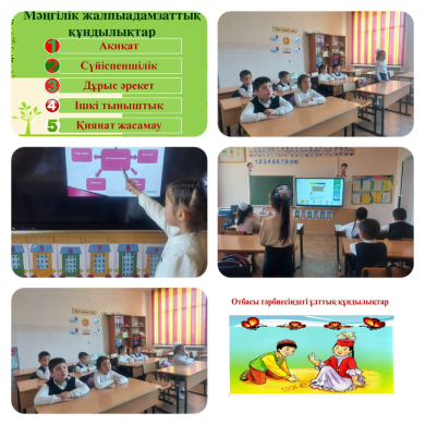 03.04.2023ж күні 2"А" сыныбында сынып сағатты өтті.Тақырыбы: "Ұлттық құндылықтарды насихаттау". Мақсаты:Оқушыларға ұлттық құндылықтарды құрметтеуге тәрбиелеу ,ұлттық құндылықтар- біздің тіршілігіміз бабаларымыздан қалған асыл мұра екенін түсіндіру.