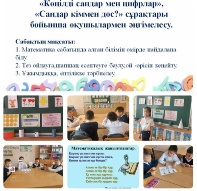 2"А"сынып оқушыларымен "Сандар кіммен дос?"сұрақтары бойынша әңгіме жүргізілді, сонымен қатар ребус, сөзжұмбақтар шешті.