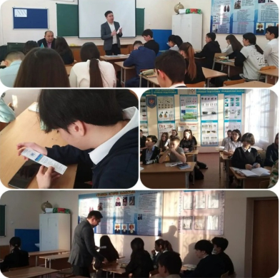 26.01.2023 жылы Ж.К.Букенов атындағы Қарағанды банк колледжінен 9а, 9б, 9в сыныптарына кәсіптік бағдар бойынша үгіт-насихат жұмыстарын жүргізді.