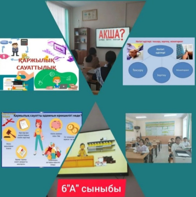 27.02.күні 6"А" сыныбында "Қаржылық сауаттылық заман талабы" тақырыбында сынып сағаты өтті. Мақсаты: оқушылардың экономикалық білімдерін тексеру, тиянақтау, одан әрі танымдылық қабілеттерін арттыру.