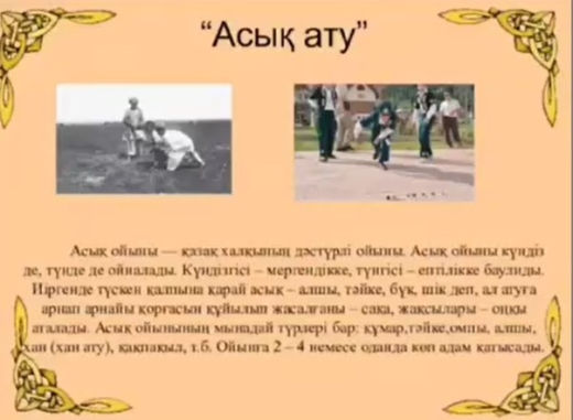 Наурыз мерекесіне орай, “Ұлттық ойындар- ұлтымыздың құнды мұрасы” тақырыбында 2 “А” сынып оқушылары “Асық ату” және “Орамал тастамақ” ойындарын ойнады. Мақсаты: Ұлттық ойындарды ойнай отырып, өз ұлтына деген сүйіспеншілігін арттырып, салт-дәстүрлерді сақт