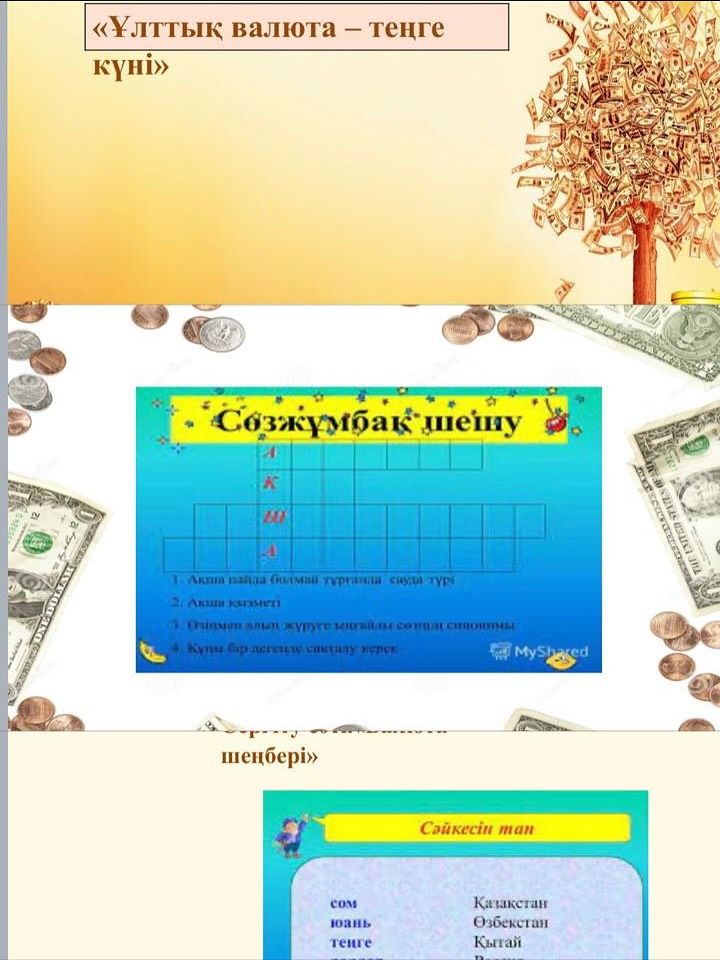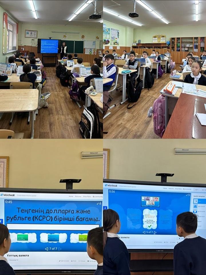 4 ”А” сыныбында “Ұлттық валюта - теңге” тақырыбында сынып сағаты өтті. Оқушылар ұлттық валюта теңгенің шығу тарихы, ондағы өрнектер, дизайнын жасаушы авторлық топпен танысты. Білімді ойын арқылы бекітті.