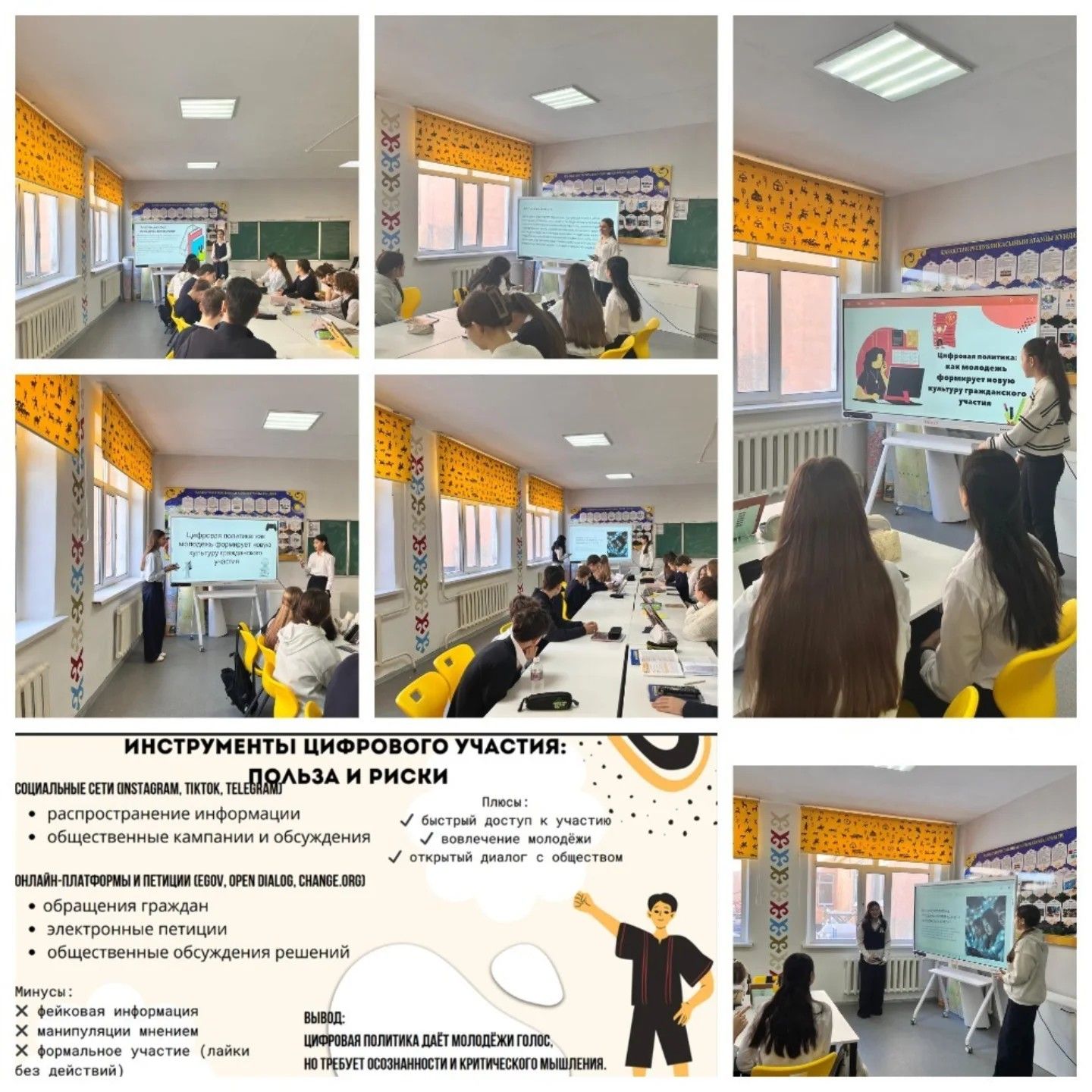 «Адал азамат» бағдарламасы аясында және айдың құндылығы – «Заң және тәртіпті» іске асыру шеңберінде, сондай-ақ «Құқықтық навигатор» құқықтық сауаттылық апталығы аясында 8 «З» сыныбында. «Цифрлық саясат: жастар азаматтық қатысудың жаңа мәдениетін қалай қалыптастырады» тақырыбында дөңгелек үстел өткізілді.Іс-шара барысында оқушылар цифрлық ортадағы азаматтық белсенділіктің заманауи түрлерін талқылап, әлеуметтік желілердің, онлайн-платформалардың, петициялардың және электронды қоғамдық талқылаулардың қоғам өміріндегі рөлін бағалады.Талқылау барысында келесі мәселелерге ерекше назар аударылды:- жастардың цифрлық құралдар арқылы азаматтық ұстанымын қалай білдіре алатыны;- онлайн-платформалардың мемлекет пен қоғам арасындағы диалогқа қандай мүмкіндіктер ашатыны;-цифрлық қатысудың пайдасы мен ықтимал қауіптері.Оқушылар пікірталасқа белсенді қатысып, танымал платформалардан мысалдар келтіріп, нақты жағдайларды талдап, заманауи технологиялардың азаматтық қатысудың жаңа мәдениетін қалай қалыптастырып отырғаны туралы өз ой-пікірлерін білдірді.