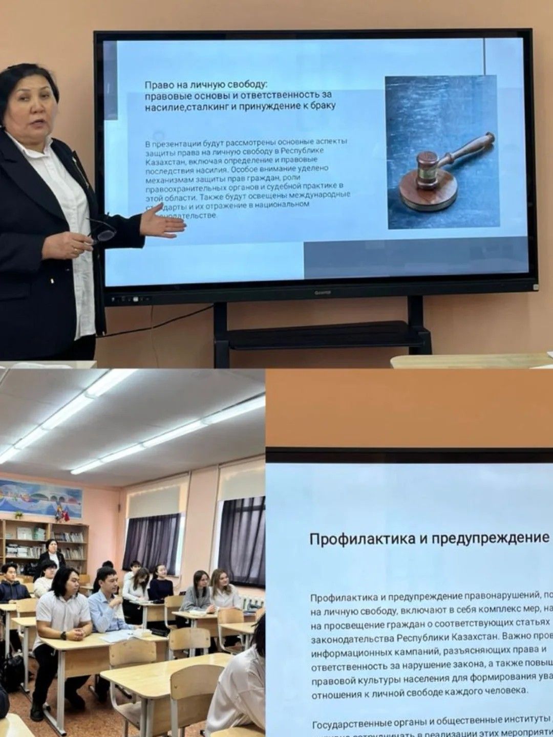 В 11а классе учителем истории Саденовой А. Б. проведена беседа на тему: « Право на личную свободу: правовые основы и ответственность за сталкинг и принуждение к браку»